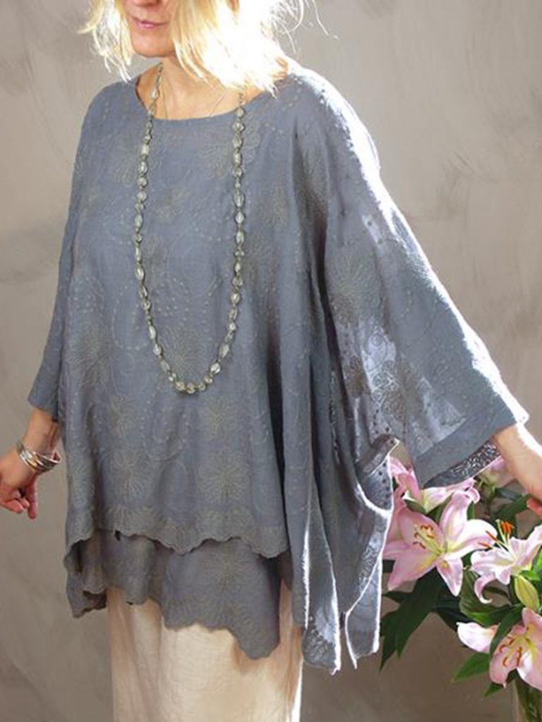 Round collar over shirt w/layered hem and full sleeves.
